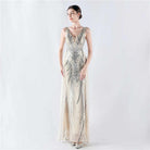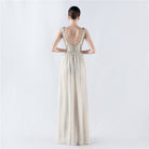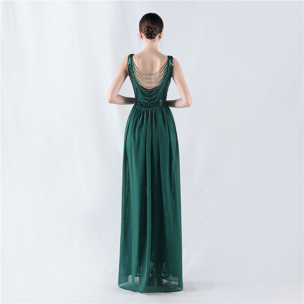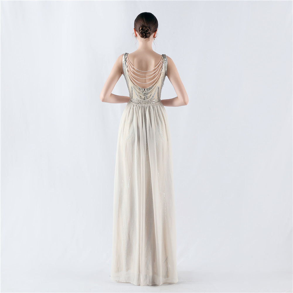 El escote en V delantero y el diseño de espalda abierta con cadenas colgantes de pedrería añaden un toque moderno y sofisticado, ideal para eventos donde deseas brillar sin esfuerzo. La abertura lateral en gasa le da fluidez y movimiento, haciendo que cada paso sea memorable.