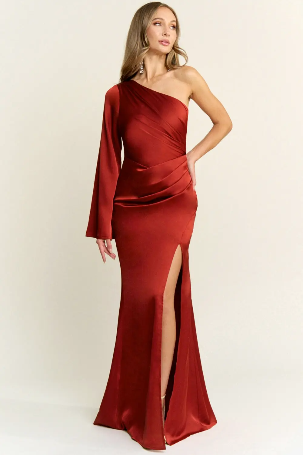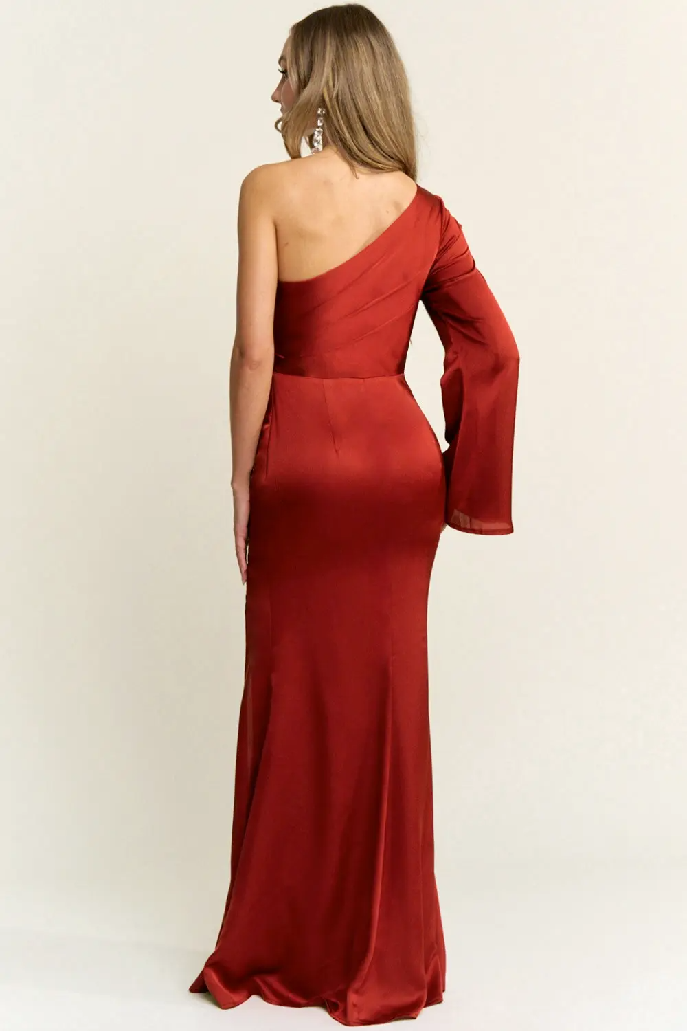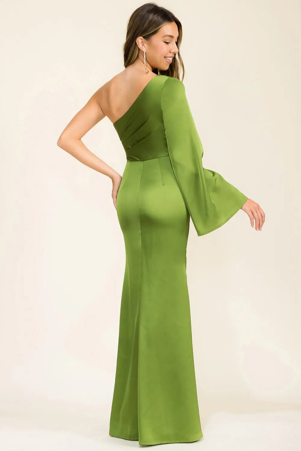 Este vestido largo destaca por su manga amplia y fluida tipo capa, que aporta movimiento y un toque glamuroso al diseño. Su corte ajustado que abraza la figura resalta la silueta de forma elegante, mientras que la abertura frontal en la pierna añade un detalle moderno y sensual que estiliza las piernas.