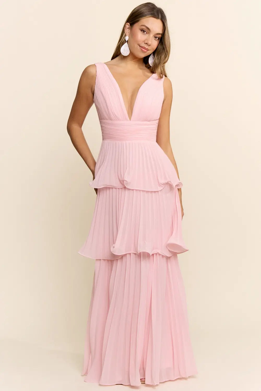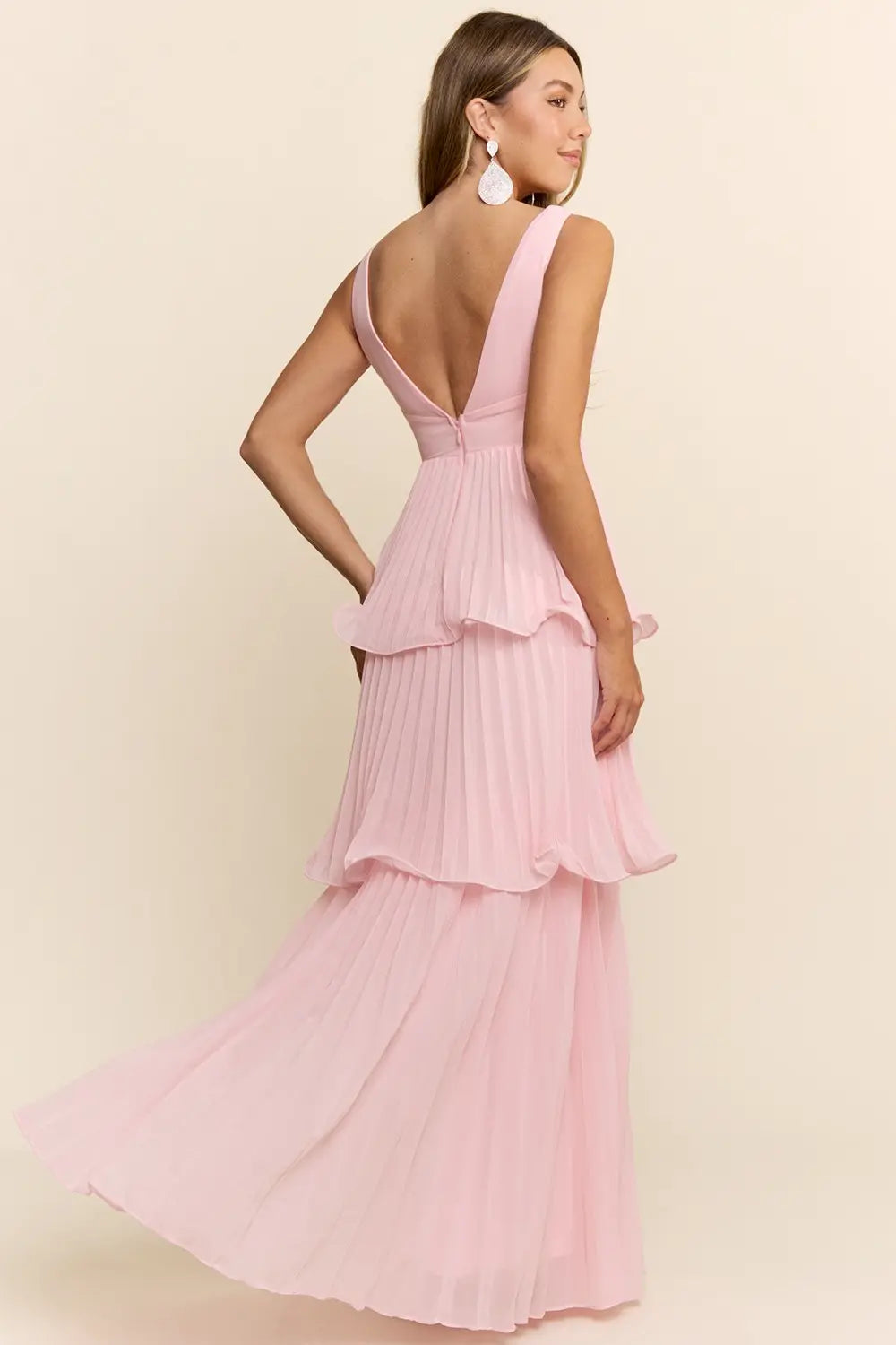 Este hermoso vestido largo en tono Pink Mauve combina elegancia y delicadeza en un diseño femenino y sofisticado. Su escote en V tanto al frente como en la espalda estiliza la silueta y aporta un toque moderno y atractivo.