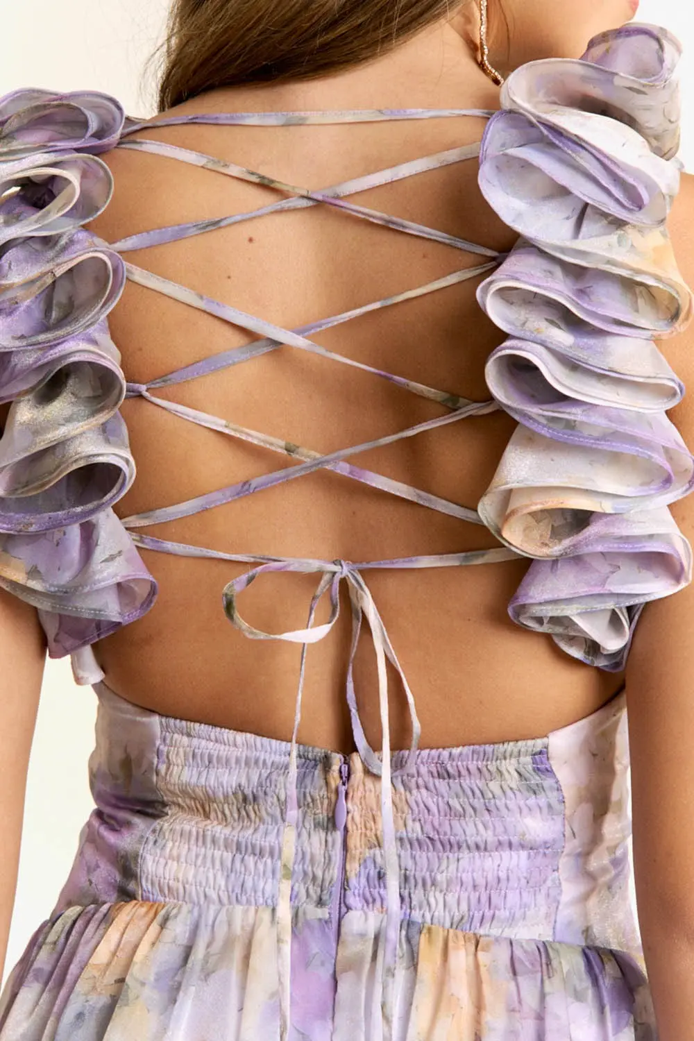 En la parte posterior, el vestido luce una espalda descubierta con ajuste de cordón entrelazado tipo zigzag, lo que permite adaptarlo perfectamente al cuerpo y resaltar la silueta con un acabado elegante.