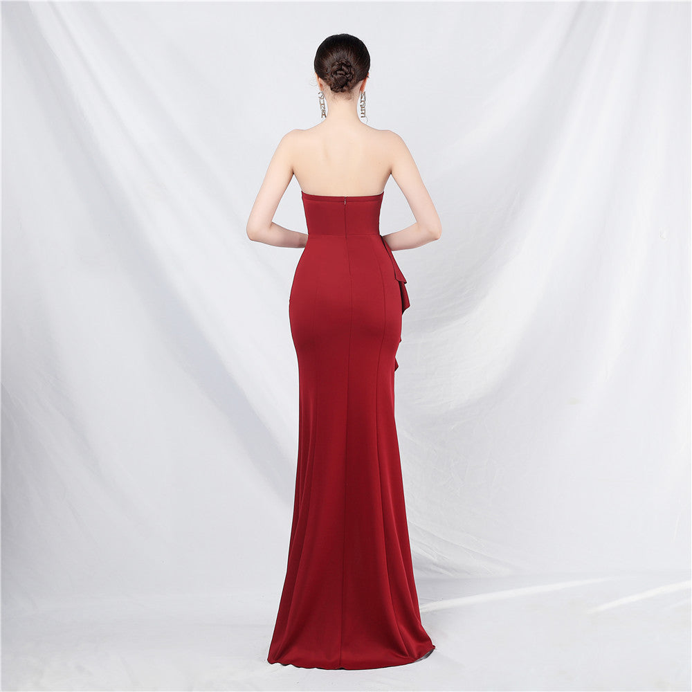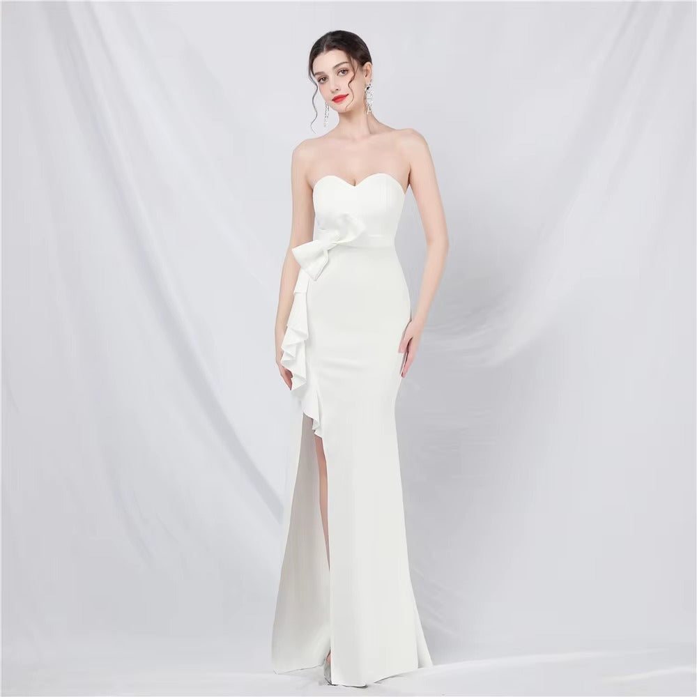 Diseño strapless que realza los hombros y el escote de manera elegante.