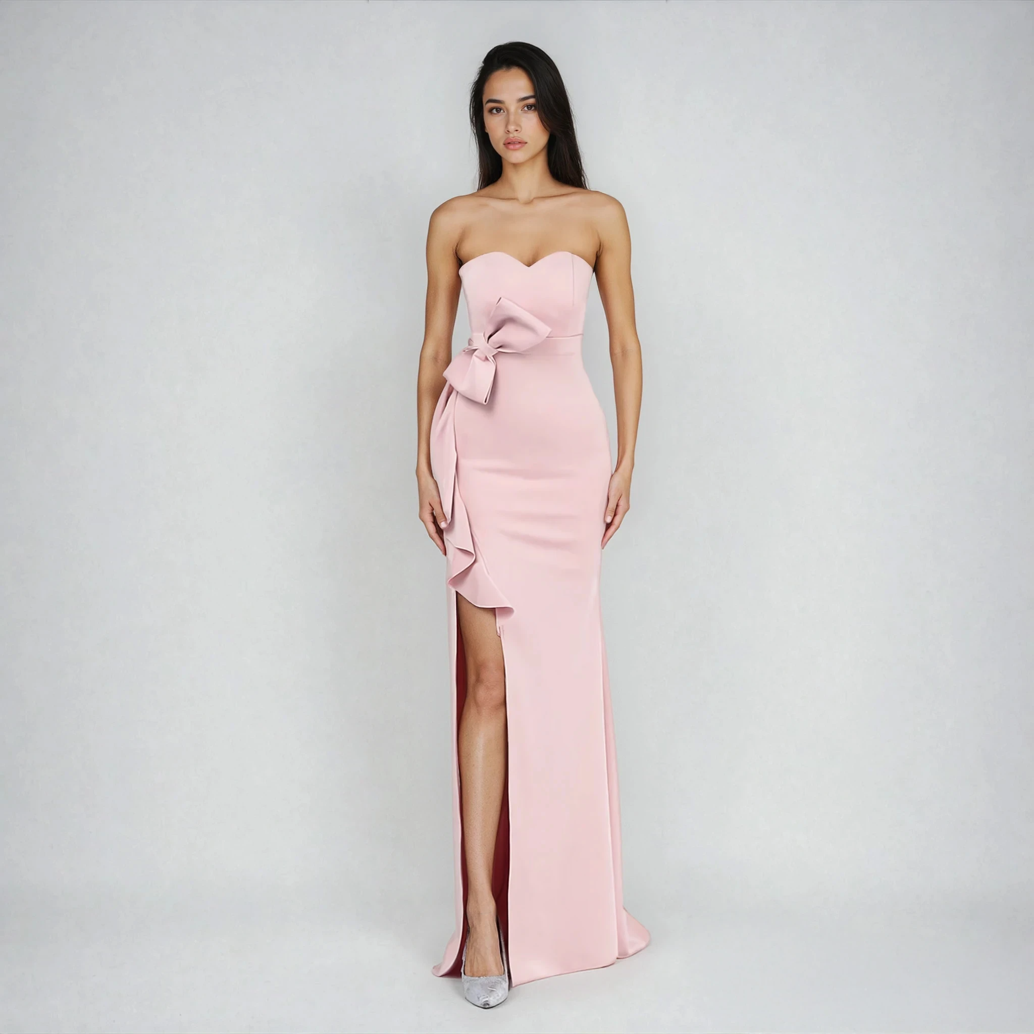 Vestido de Fiesta EV705 – Elegancia con Lazo y Abertura Alta 🌹✨